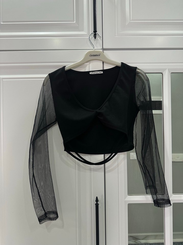 Dar kesim siyah bluz, V yaka ve drapeli detaylara sahiptir. Uzun tül kollu ve kısa boydadır, gotik tarz için uygundur. Sentetik kumaştan üretilmiştir.