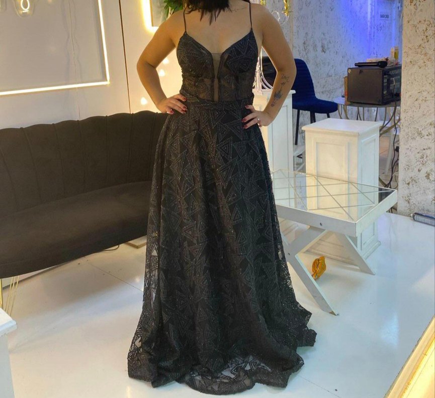 Siyah uzun abiye elbise, V yaka ve ince askılıdır. Drapeli ve desenli yapısıyla gotik tarzı yansıtır, düzenli kesime sahiptir. 1 kez giydim çok ağır bir duruşu var siyah gelinlik bile denebilir