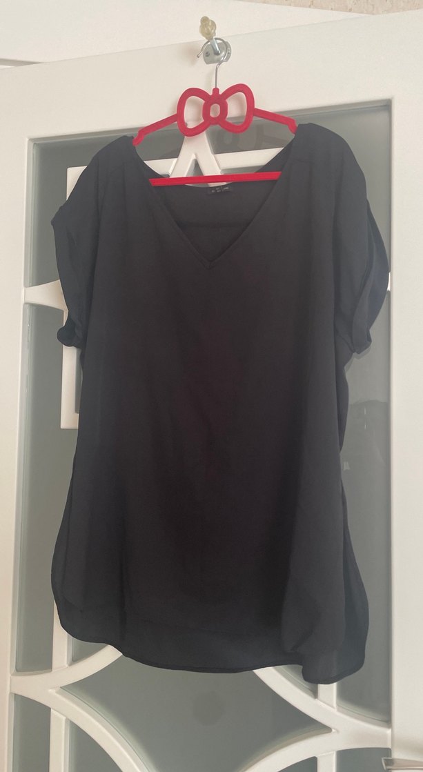 Siyah renkli, V yaka ve kısa kollu hamile bluzu, bol kesim ve drapeli tasarıma sahiptir. İpek gibi kumaştan, günlük kullanıma uygundur.