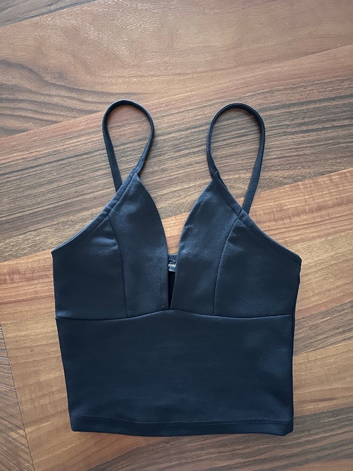 Siyah ,V yaka ve ince askılı, vücuda oturan crop. xs - s bedenlerine uygundur . Etiketi üzerindedir , giyilmemiştir