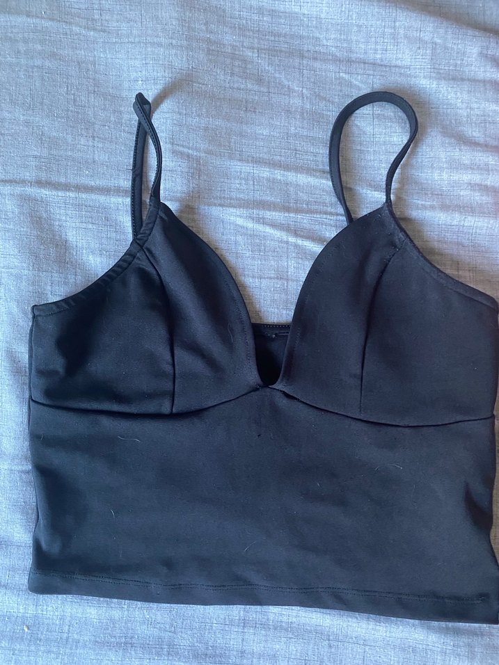 Siyah bustiyer, V yaka ve ince askılıdır. Pürüzsüz sentetik kumaştan yapılmış, minimalist gotik tarzı ve günlük kullanım için şık bir seçenektir.