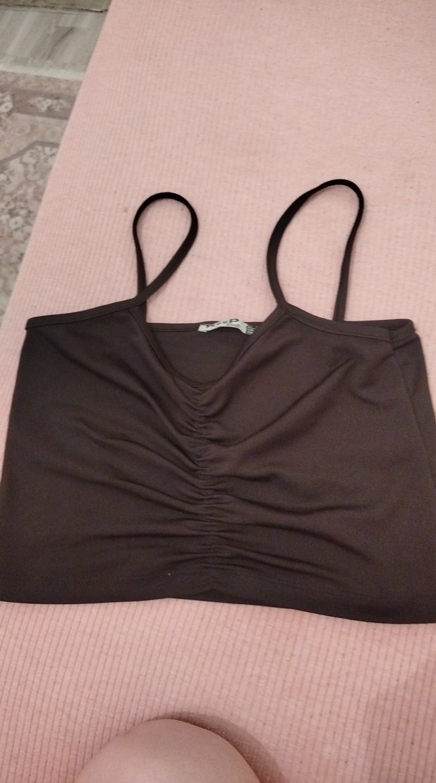 Siyah, V-yaka ve ince askılı, gövdeye oturan normal midi uzunlukta crop. Desensiz, sade tasarım.