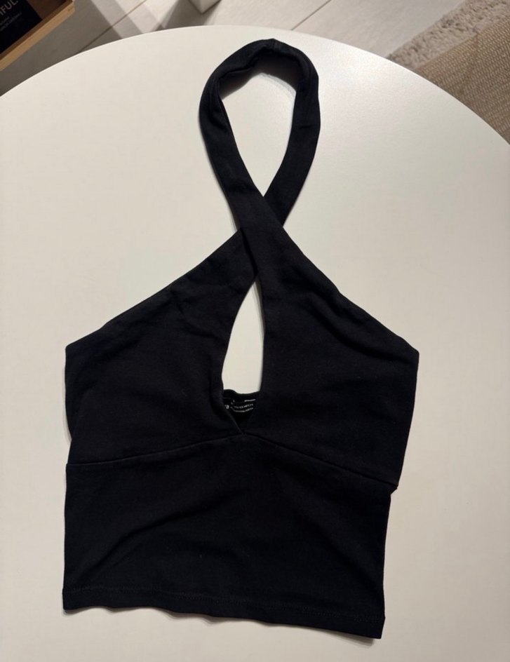Siyah, ince askılı ve V yakalı bu crop top, düz ve şık sentetik kumaştan üretilmiştir.