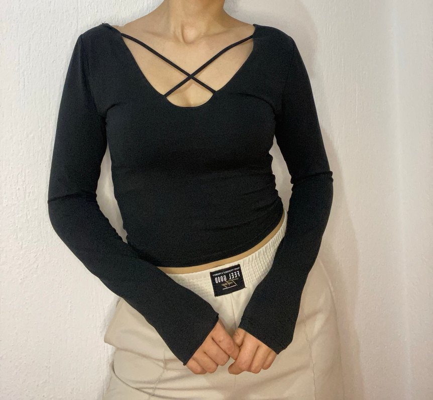 Pamuk kumaştan, ince askılı ve V yakalı siyah, dar kesim kadın bluz. Günlük kullanıma uygun şık ve rahat bir tasarım.