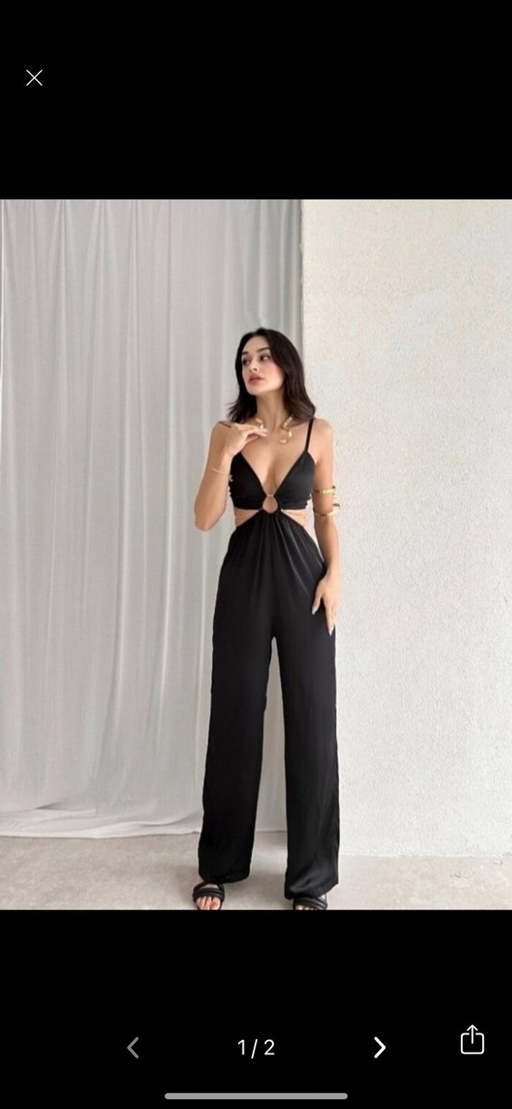 Siyah uzun tulum, v yaka ve ince askılarla fit kesim sunar. İpeksi kumaştan yapılmış, romantik akşamlar için zahmetsiz şıklık sağlar. Desensiz ve sokak modasına uygun.
