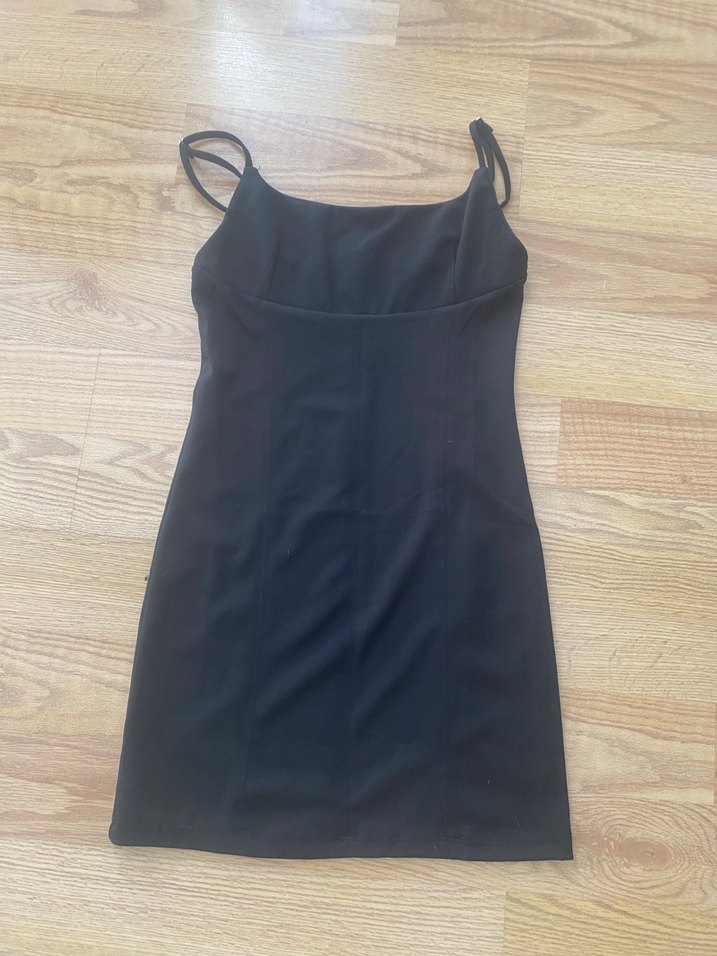 V yaka ve ince askılı, siyah renkli, midi uzunlukta, sade ve şık kadın gece elbisesi. Romantik akşamlar için uygun.