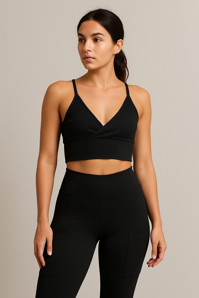 V yaka ve ince askılı, siyah renkli, vücuda oturan spor tayt ve crop büstiyer takım