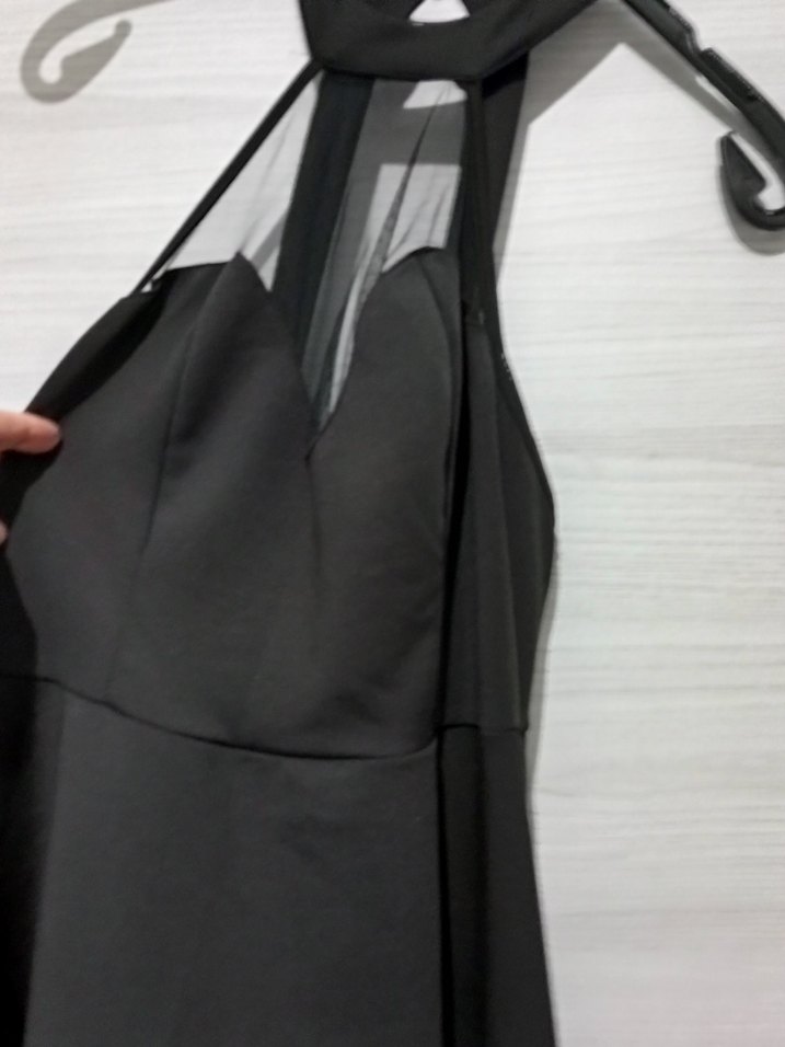 Siyah, v yaka ve ince askılı, fermuarlı sırt detayıyla uzun ve vücuda oturan abiye elbisedir. Minimalist gotik tarzıyla ofis kullanıma uygundur.