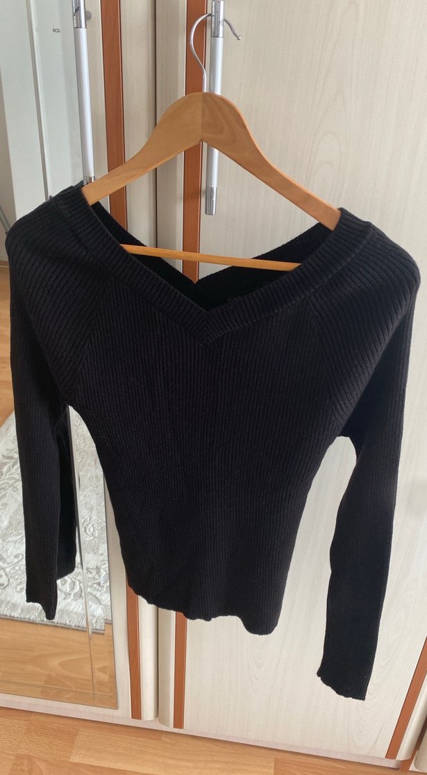 Siyah renkli, V yaka ve uzun kollu, ince triko dokusuyla günlük kullanıma uygun, rahat ve şık bir kadın kazağıdır.