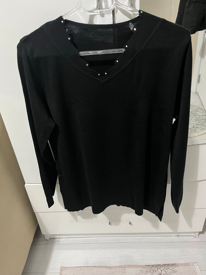 Siyah yün kumaştan, boncuk detaylı V yaka ve uzun kollu, rahat ve bol kesim kadın kazak.