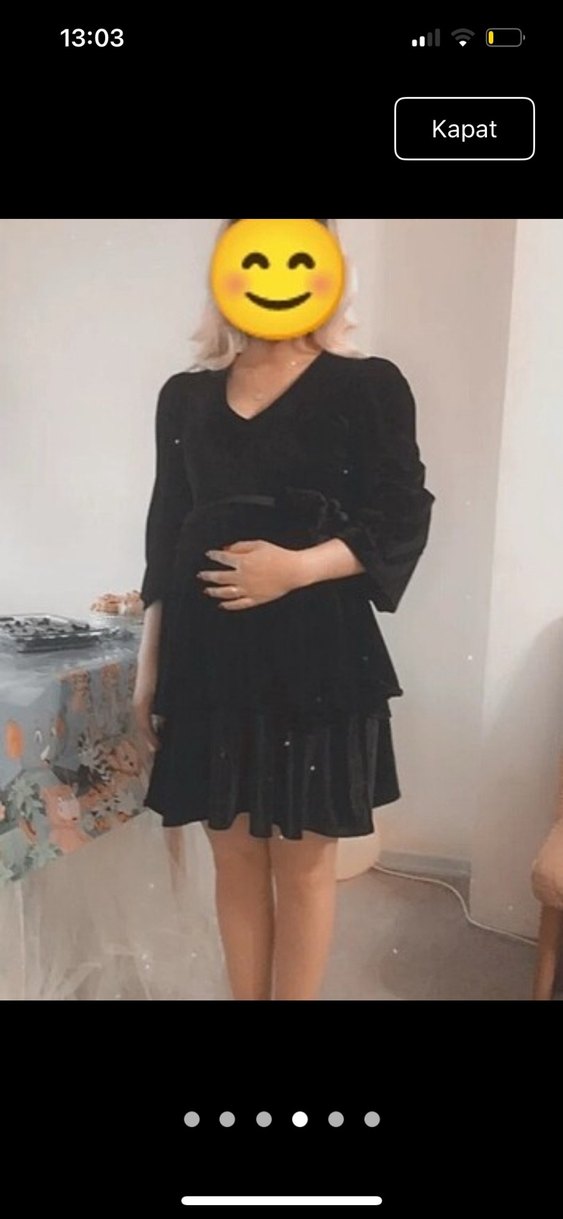 Siyah kadife , V-yaka, uzun kollu ve fırfır detaylı. Salaş kesim, batik desenli, parti için uygun.