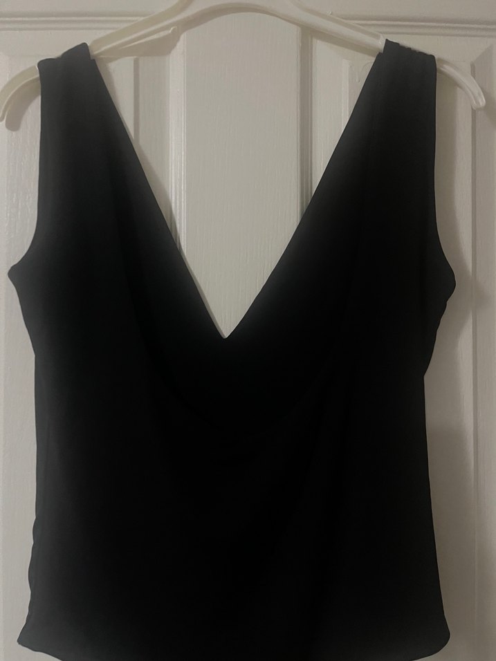 Kadınlar için V yaka, kolsuz, fit kesim siyah atlet. İpeksi kumaştan, cesur ve minimalist gotik tarzda, günlük kullanım için uygundur. Saten gibi kumaş şık