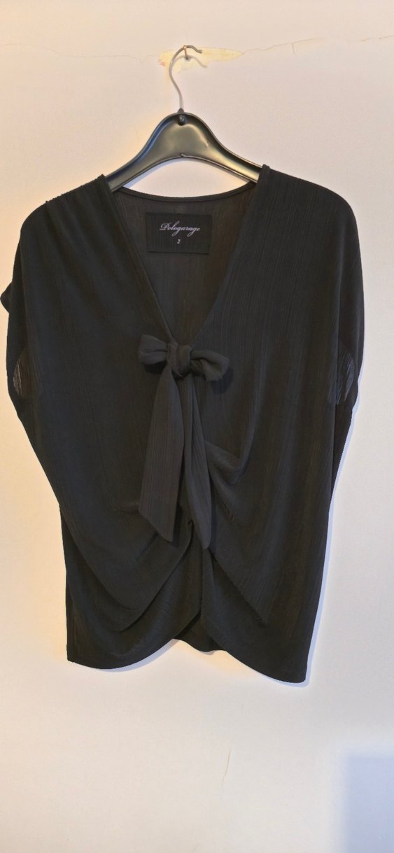 Siyah, V yakalı, kısa kollu, onden bagcik detayli ve drapeli kadın bluz, günlük ve gece kullanıma uygundur.
