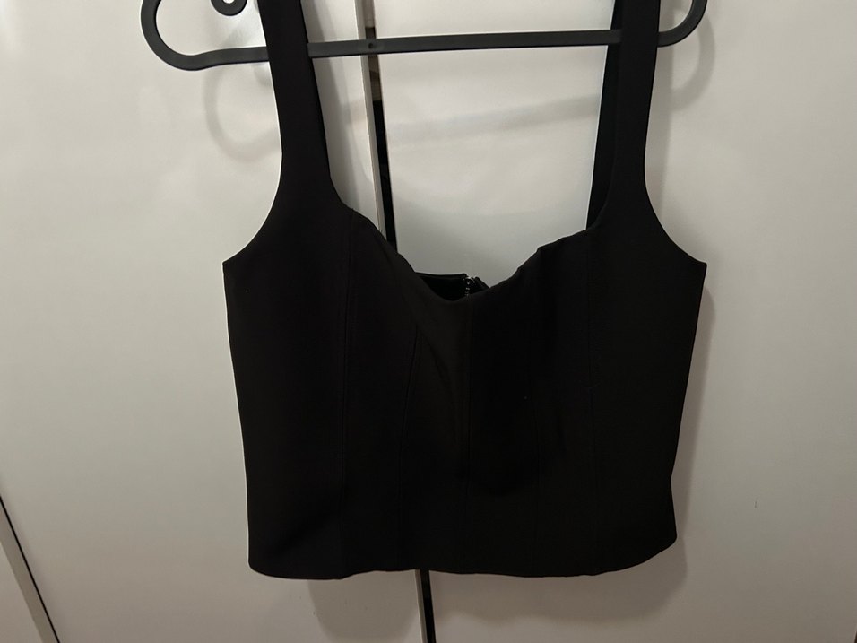 Siyah, V yakalı ve kolsuz, vücuda oturan korse görünümlü bustiyer. Düz siyah ve sentetik kumaştan yapılmıştır, gotik tarzda günlük kullanım için uygundur.