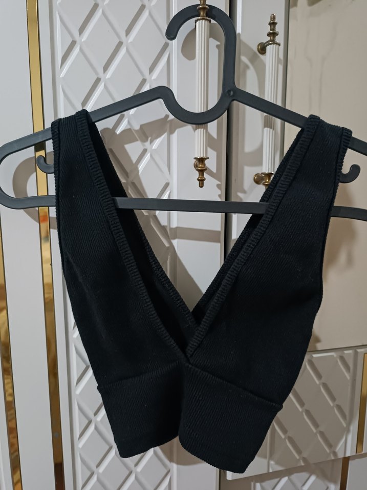 Siyah, V yakalı ve ince askılı, sentetik kumaştan yapılmış, günlük kullanıma uygun, vücuda oturan bustiyer.