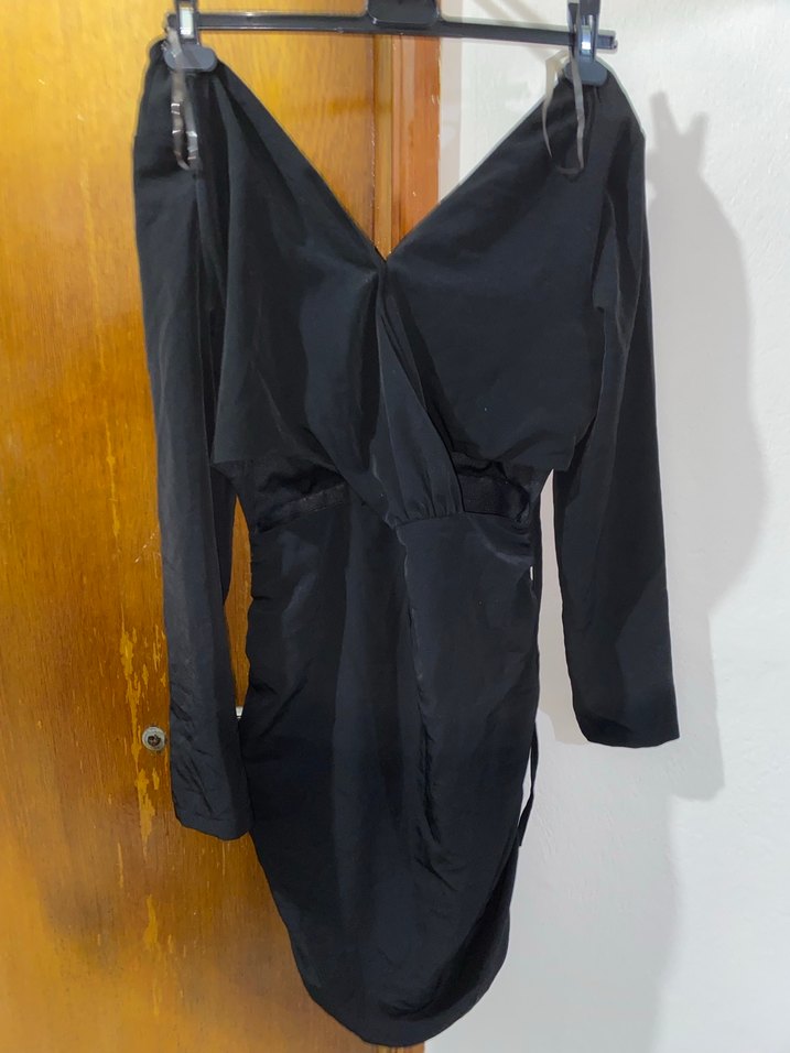 Bu siyah, v yaka, kenarları büzgülü, bel kısmı pencere dekolteli kadın elbise, kemerli ve dar kesimdir. Uzun kollu ve desensiz tasarımıyla romantik akşamlar için uygundur. ✨