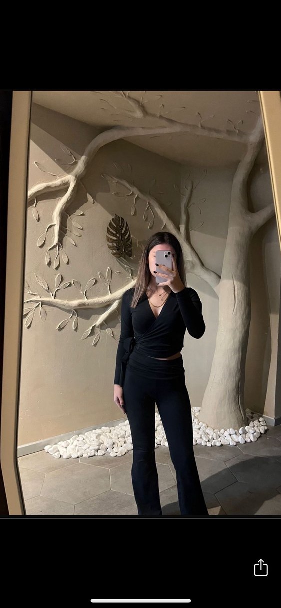 Siyah, V yakalı ve uzun kollu, vücuda oturan kadın midi takım. Yumuşak ve sıcak kumaş, romantik akşamlar için ideal, minimal ve şık tarzda. ✨