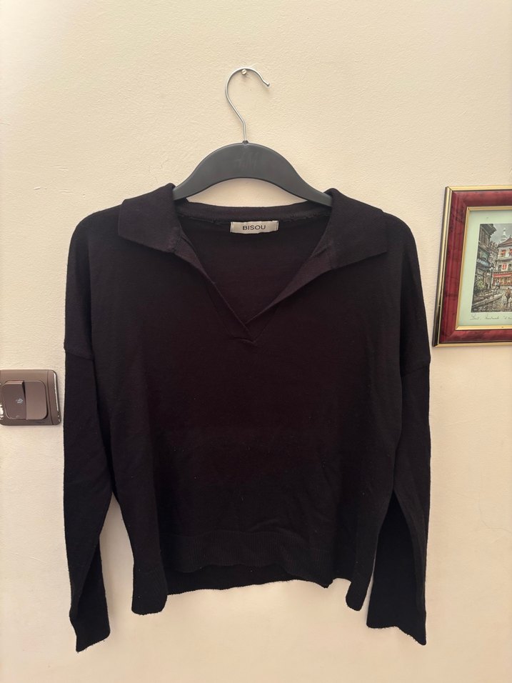 Siyah, V yakalı ve uzun kollu bluz , rahat kesimiyle minimalist ve günlük sokak stiline uygun M-L beden
