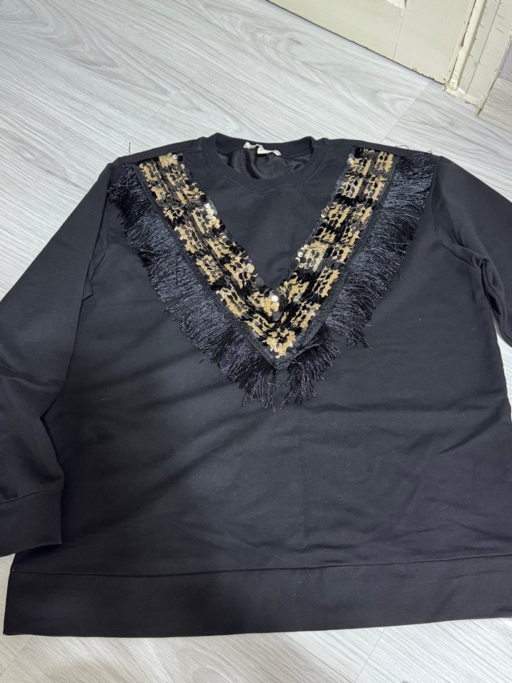 V yaka, uzun kollu, bol kesim siyah sweatshirt. Nakışlı ve kürk detaylı tasarımıyla rahat ve şık bir sokak stili sunar.