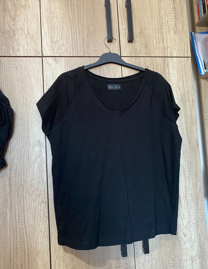Keten kumaştan, kısa kollu ve bol kesim siyah V yaka kadın tişörtü. Günlük kullanım için rahat ve şık bir sokak stili parçası.