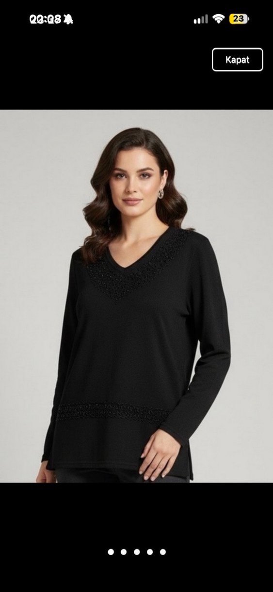 Siyah V yakalı, uzun kollu ve rahat kesimli kadın trikosudur. Yumuşak ve sıcak kumaştan yapılmış olup günlük kullanım için çağdaş bir stil sunar.