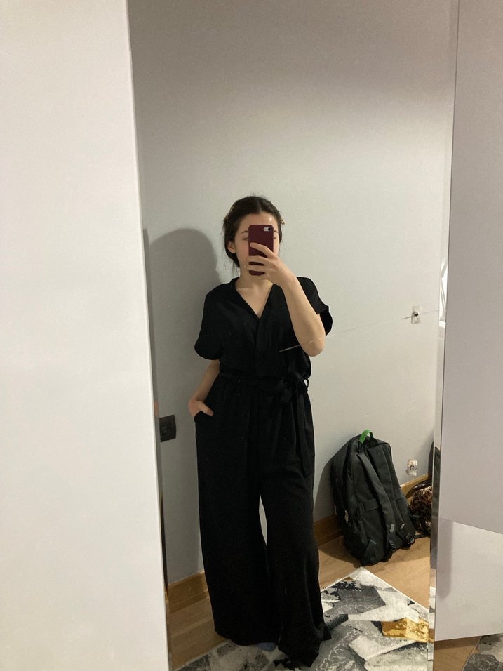 Siyah, V yakalı midi uzunlukta, kısa kollu, bol kesim, ipeksi dokulu kadın tulumu. Günlük kullanım için zahmetsiz şıklık sunar. ✨ Hiç defosu yoktur. Kuşaklı ve beli lastikli.