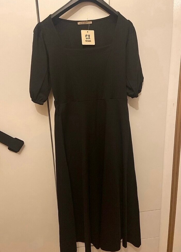 Siyah uzun elbise, bol kesim, kısa kollu ve V yakalıdır. İpek gibi kumaştan üretilmiş, ofis için uygun, goth tarzında şık bir görünüme sahiptir.
