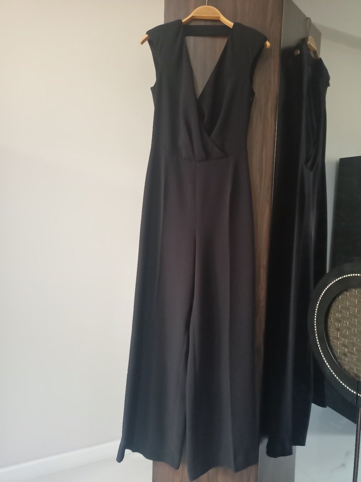 Siyah, krep kumaş dokulu, drapeli V yakalı, kolsuz, uzun tulum. Modern klasik tarzda, ofis için uygun, minimalist ve rahat kesim.