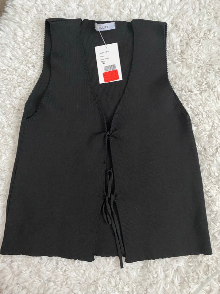 Siyah kadın yelek, V yaka ve normal kesimlidir. Kolsuz, yumuşak ve rahat kürk detaylıdır, dış mekan kullanımı için uygundur. Midi boyda ve desensizdir.