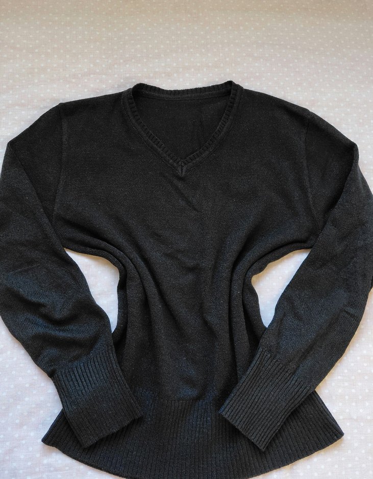 Siyah renkli, V yaka ve uzun kollu kadın yün kazak. Yumuşak örgü yapısıyla rahat ve bol kesim, günlük kullanım için uygundur.
