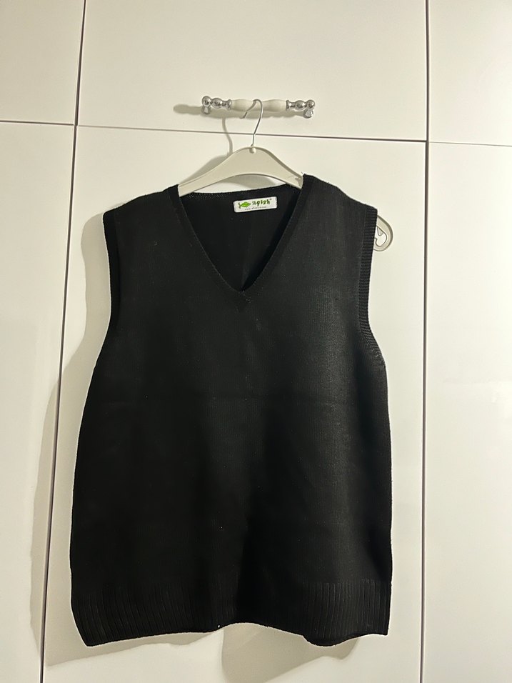 Siyah yün, kolsuz, V yakalı ve bol kesim kadın süveter. Günlük kullanıma uygun, minimalist ve rahat bir tarz sunar. Biraz tüylenmesi mevcut. Telkliflere açığım. Marka temsilidir.