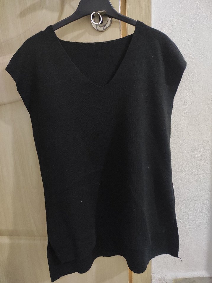 Siyah renkte, V yaka ve kolsuz tasarıma sahip kadın yün süveter. Gevşek kesimi ve midi boyu ile günlük kullanıma uygun, sade ve minimal bir görünüm sunar.