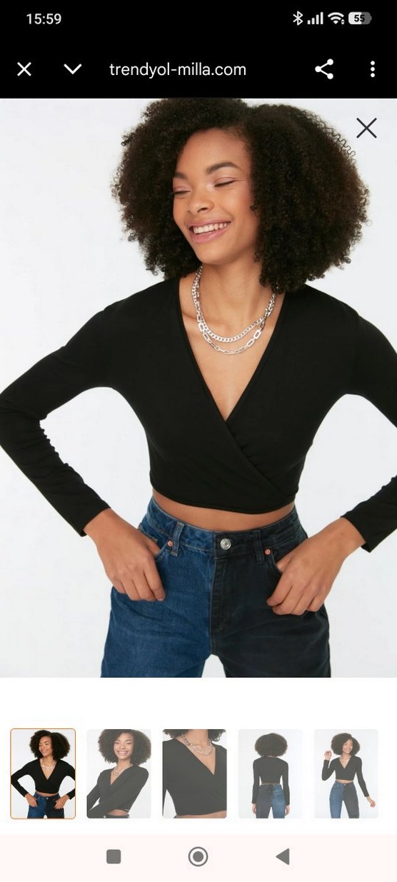 Bu siyah kot kumaşlı bluz, V yaka ve uzun kolludur. Kemer detaylı ve kısa boyda, günlük sokak stiline uygundur.