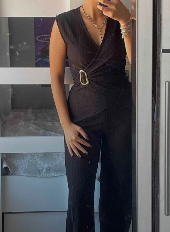 siyah uzun tulum, V yaka ve kemerli bel detayına sahiptir. Askılı kollu, çağdaş tarzda ve ofis kullanımı için uygundur. Düzenli kesim ve hafif yılan deseni bulunur.