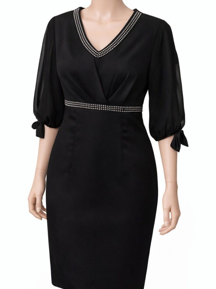 Siyah parlak kumaştan, V yakalı, kemerli ve strappy kollu midi boy dar kesim elbise, ofis için uygun şık ve zarif bir modeldir. ✨