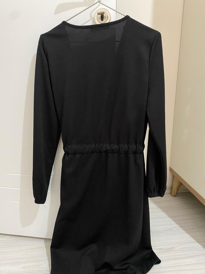 Siyah midi elbise, uzun kollu, V yaka ve kemerli, sade ve desen içermeyen tasarımıyla ofis kullanımı için uygundur. Tunik