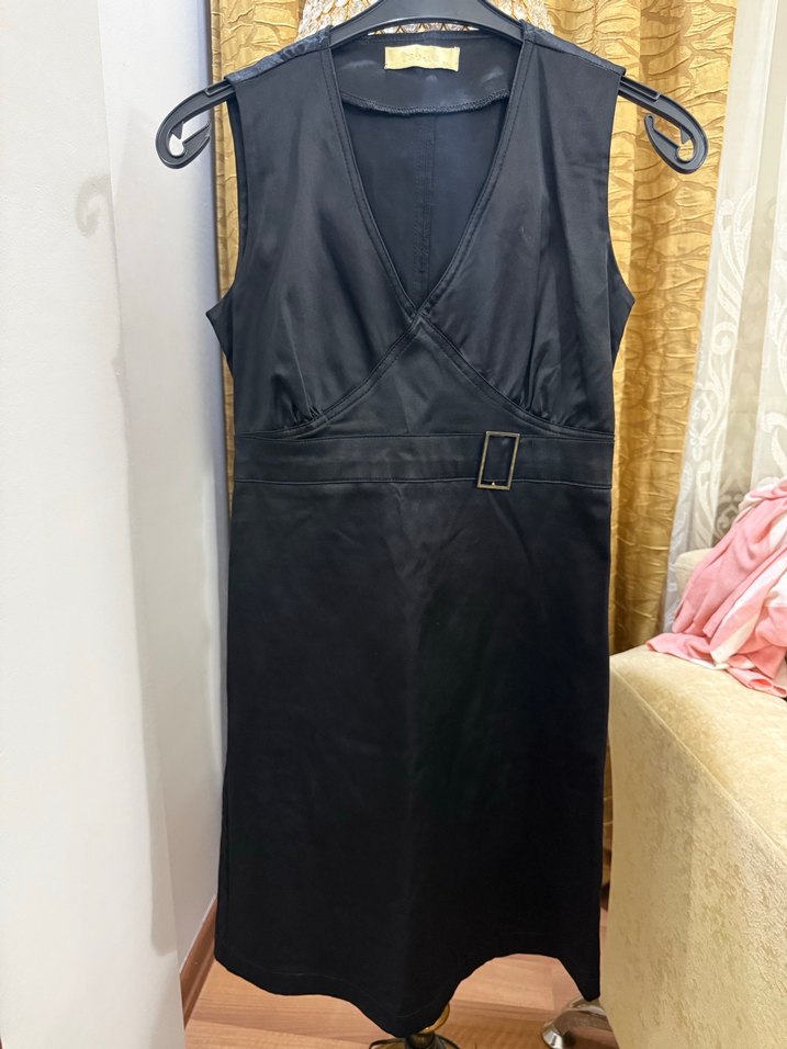 Kolsuz, V yakalı siyah midi elbise, kemerli ve normal kesim. Ofis ve klasik şıklık için uygundur.