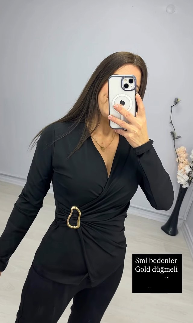 Siyah, satenimsi kumaştan, V yaka, uzun kollu, kemerli mini elbise. Ofis ve günlük şıklık için uygun. S, M, L bedenlerde, altın renkli toka detayı bulunur. 430do