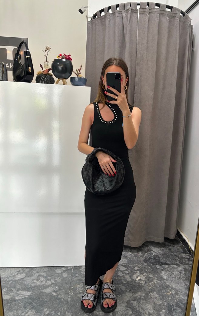 Siyah, kolsuz, uzun deri elbise. V yaka ve kemer detayıyla dar kesim. Koyu yılan derisi desenine sahip, trend sokak stili için uygun.