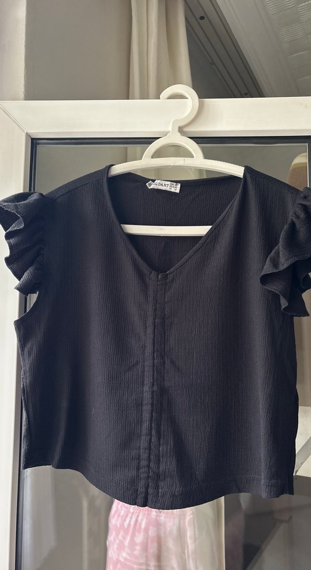 Siyah keten kumaştan, V yakalı ve fırfırlı kısa kollu, rahat kesim midi boy bluz. Minimalist tasarıma sahip, günlük sokak stili için uygun.