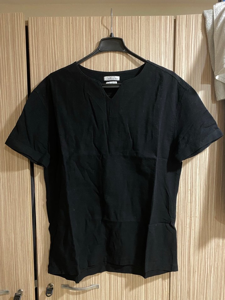 Siyah, keten kumaştan, kısa kollu ve V yakalı erkek tişörtü. Rahat kesimi ve minimalist sokak stiliyle günlük kullanıma uygundur.
