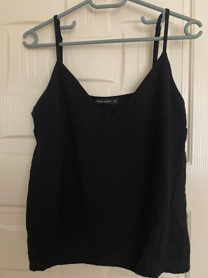 Siyah, v yaka ve kolsuz tasarıma sahip, ipek görünümlü ve bol kesim askılı kadın bluz. Minimalist ve gotik tarzda, günlük kullanıma uygun midi boyda.