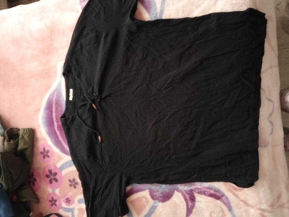 Siyah keten kumaştan, kısa kollu, V yaka ve düğmeli detaylı, bol kesim midi uzunluğunda kadın gömleği. Günlük ve sokak stiline uygun.