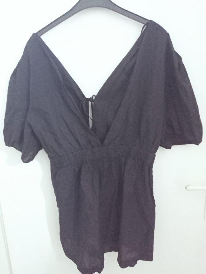 Siyah keten kumaştan, V yaka ve kısa kollu, bol ve drapeli kesime sahip midi boy kadın tulum. Minimalist gotik tarzda, günlük kullanıma uygun.