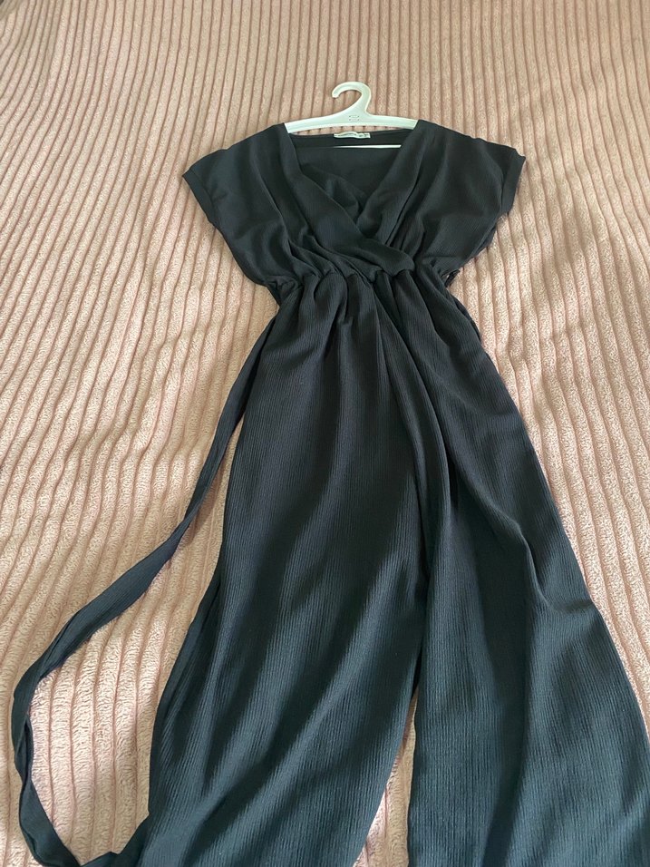Siyah keten kumaştan, V yakalı, kolsuz, bol kesim ve drapeli uzun tulum. Minimalist bohem tarz için uygundur.
