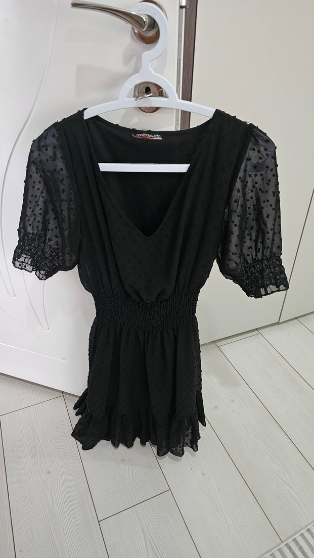 V yaka, kısa ve oturan siyah mini elbise. Kabarık kısa kollarda fırfır detayları bulunur. Yumuşak sentetik kumaştan, gotik ve bohem tarzlara uygundur.