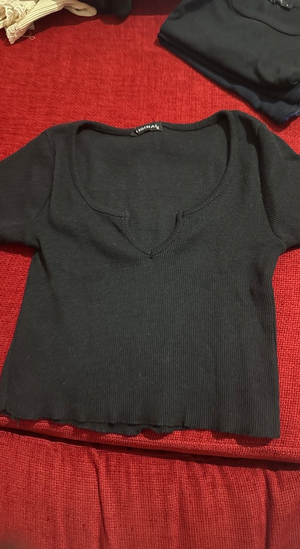 Yumuşak sentetik kumaştan, V yakalı ve kısa kollu, siyah fitted crop top. Günlük kullanım için uygun, rahat gotik tarz sunar. ✨