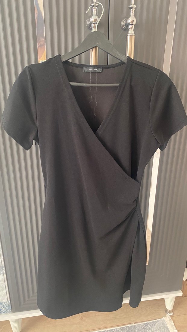 Kısa kollu ve V yakalı, siyah renkte sentetik kumaştan yapılmış, normal boy midi elbise. Günlük kullanım için şık ve rahat bir seçim.