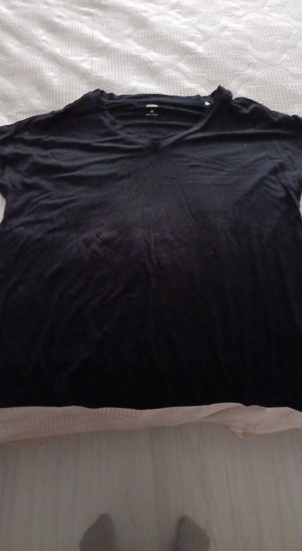 Yumuşak keten kumaştan, kısa kollu ve V yakalı, rahat kesim siyah hamile üstü. Günlük kullanıma uygun, minimalist tarzda.
