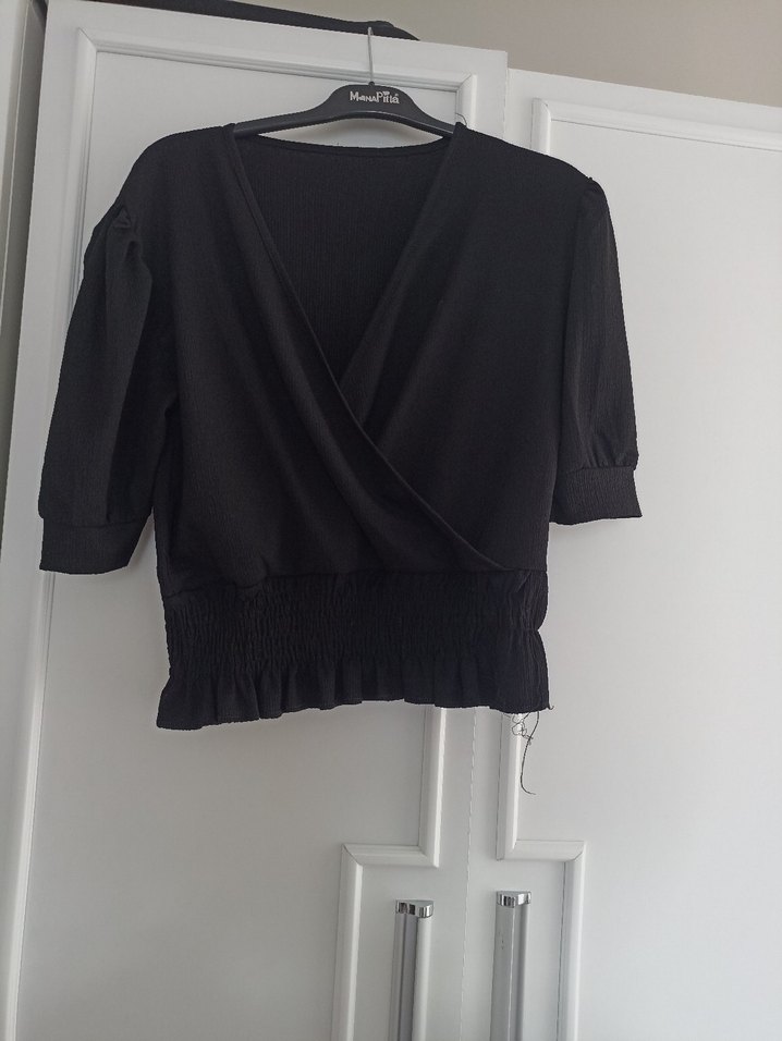 Siyah keten kumaştan, V yaka ve kısa kollu, bol kesim ve drapeli tasarıma sahip kadın bluz. Kısa boy ve lastikli etek ucu günlük goth tarzı sunar.